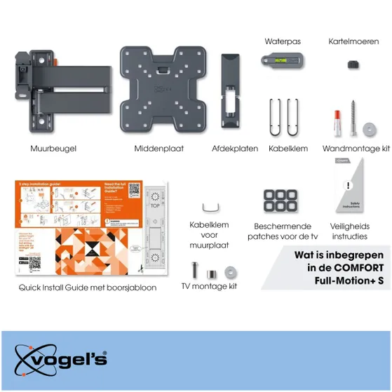 De installatie van de Vogels TVM 3245 is eenvoudig en snel. In de verpakking vind je een boormal, schroeven, fischer® DuoPower pluggen, kabelbinders en een waterpas. Met de gratis DrillRight™ AR App van Vogel’s teken je het eerste boorgat eenvoudig af, zodat je tv in een mum van tijd stevig en veilig aan de muur hangt.