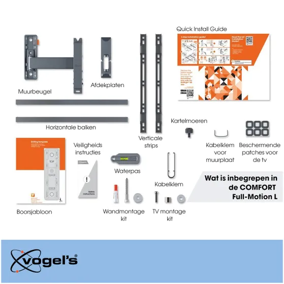 Je COMFORT Full-Motion TV installeren is niet moeilijk. Vogel’s maakt het je bovendien erg makkelijk. Een boormal, schroeven, Fischer DuoPower pluggen, kabelbinders en een waterpas zijn bijgesloten in de verpakking. Het eerste boorgat teken je eenvoudig af met onze gratis DrillRight AR App. In de Quick Installation Guide staat stap voor stap uitgelegd hoe je alles installeert. Ook kun je online de uitgebreide handleiding en de speciale installatievideo bekijken.